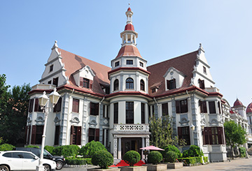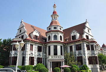 高三層,磚木結(jié)構(gòu),建筑面積2089平方米。二樓右側(cè)有個(gè)小門,門內(nèi)建鋼筋混凝土樓梯,鐵欄桿,可上至樓頂間,下至地下室、如果關(guān)上小門便找不到上下樓的去處。三樓涼亭設(shè)有鐵樓梯,直通后花園余門,由此可脫身逃走。此外,在這所樓的二、三層之間還專門設(shè)計(jì)了一間八角形房屋,幾面窗戶都朝海河,無論潮漲潮落,河水都好似往八角樓里流,象征無數(shù)財(cái)源流人。